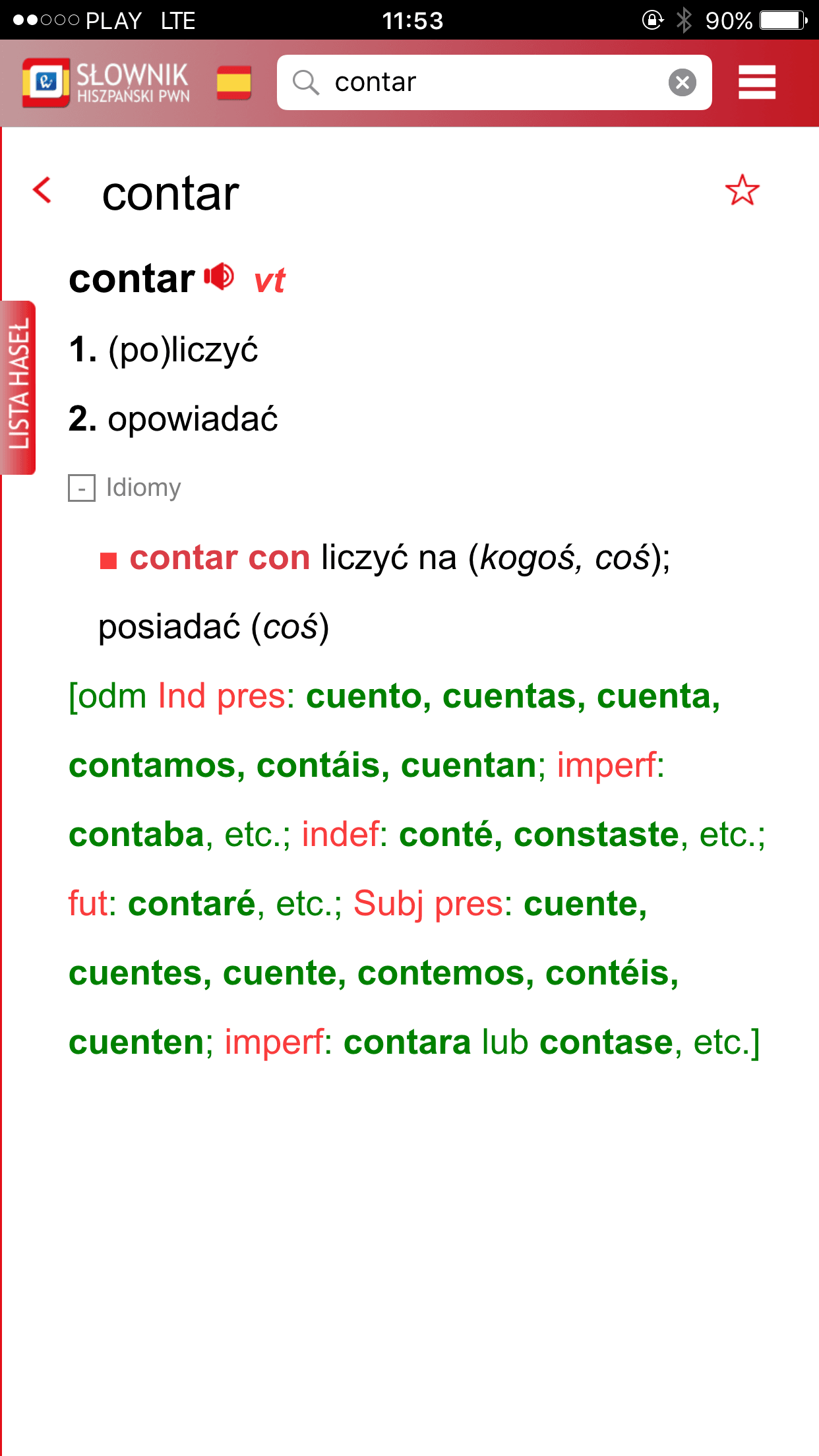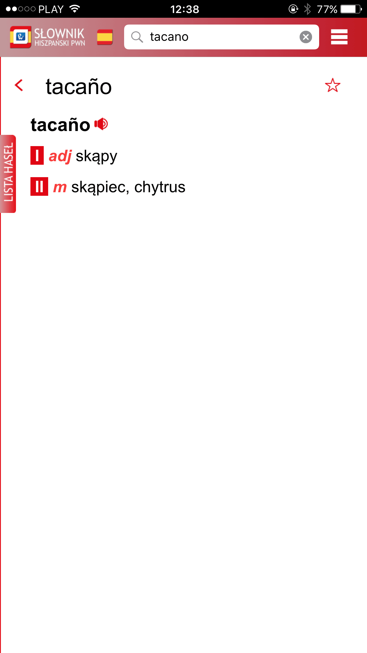 Dodatkowo po sprawdzeniu jakiegoś hasła możecie je oznaczyć gwiazdką i zostanie ono zapisane w zakładce ulubione. Dotyczy to zarówno słów polskich jak i hiszpańskich. Dzięki temu możecie łatwo do nich wrócić i je utrwalić.